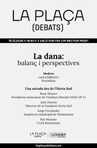 El lunes 15 de diciembre de 2025, muchas de las personas integrantes de València Saludable acudimos al Colegio Mayor Rector Peset para asistir a una nueva entrega de la Plaça Debats dedicada a la dana, ya que intervenía nuestro compañero Jorge Fernandez era uno de los ponentes. La charla llevaba por título «La DANA: balance y perspectivas».